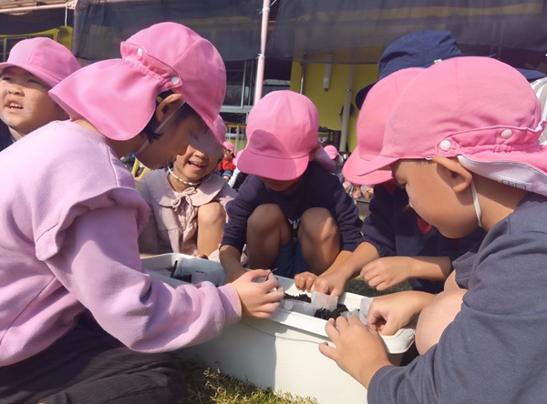 緑の募金キャラクター「どんぐりくん」とAIロボット「ふぁみたん」、司会進行役の「森のおねえさん」が登場して、森についてわかりやすく、楽しく園児たちの参加形式で進められ、森の大切さを楽しみながら学んでいました。 プランターにどんぐりをまいた後、「どんぐりを大切に育てます」と宣言してイベントは終了しました。