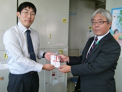 11月2日(木) 株式会社イブキ様から同社の卵の売上の一部より「緑の募金」へ寄付があり、同社食品部鶏卵課課長代理 濱田 直幸様より当委員会松原常務理事へ贈呈していただきました。
