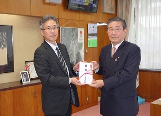 11月20日(火)株式会社新日本海新聞社様から「緑の募金」へのご寄付があり、県議会議長室に於いて、執行役員営業局長 田口智弘様より当委員会理事長(稲田寿久県議会議長)へ贈呈していただきました。