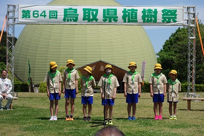 5月11日、鳥取市桂見「とっとり出合いの森 出合いの広場」にて、第64回鳥取県植樹祭が開催されました。 天候に恵まれとても暑い日でしたが、約500人の方々にご参加いただき、緑化推進の大切さの認識を深めていただきました。 式典が始まるまでの間、岩倉小学校みどりの少年団・浜坂小学校みどりの少年団の皆さんが、緑の募金活動を行いました。ご協力ありがとうございました。 式典では、オープニングアトラクションとして「逢鷲太鼓連」の和太鼓演奏が披露され、開会宣言に続いて、みどりの少年団の皆さんの元気な入場行進、三旗掲揚、主催者挨拶の後、テーマの表彰があり、第64回鳥取県植樹祭テーマ優秀賞に米子市にお住まいの服部直記さんが受賞されました。 |