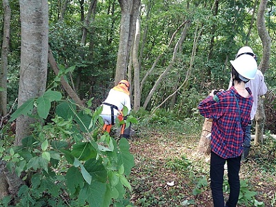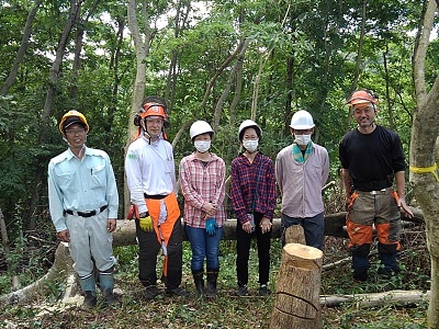 機材の扱い方、選木、倒す方向、角度、切り口、伐倒、集材等、安全を一つずつ確認、再確認しながら実施、 皆さん真剣に作業をされました。 |