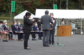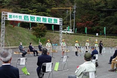 10月22日、日野町中菅「滝山公園」にて、第66回鳥取県植樹祭が開催されました。 天候にも恵まれ、たくさんの方々が参加され、緑化推進の大切さを認識していただきました。 式典では、オープニングアトラクションとして「荒神神楽(こうじんかぐら)八重垣能」が披露され、開会宣言に続いて、みどりの少年団の皆さんの元気な入場行進、三旗掲揚、主催者挨拶等の後、テーマ表彰があり、優秀賞を受賞された鳥取市の橋本和夫さんへ、内田博長理事長から表彰状と記念品が渡されました。 |